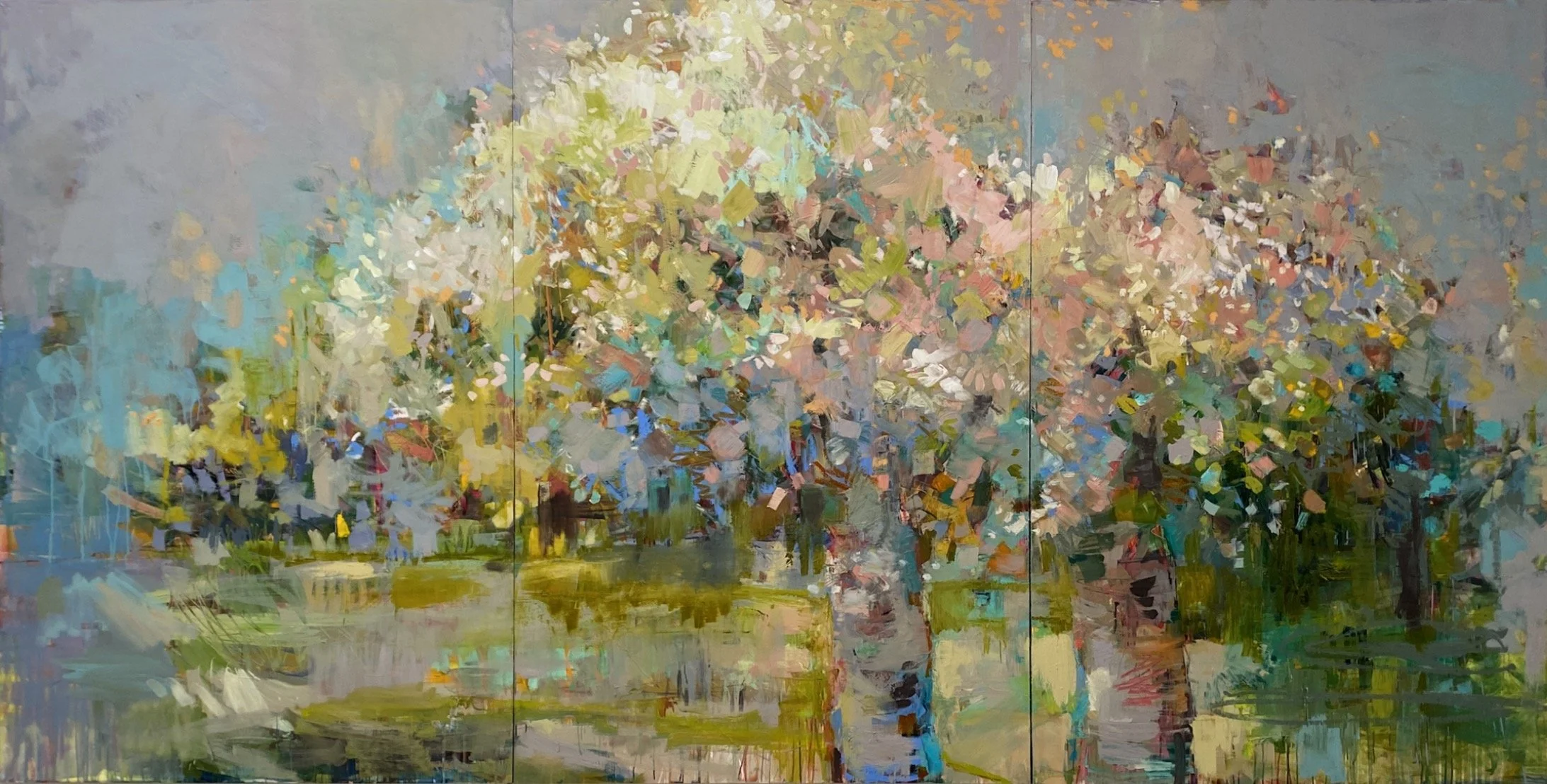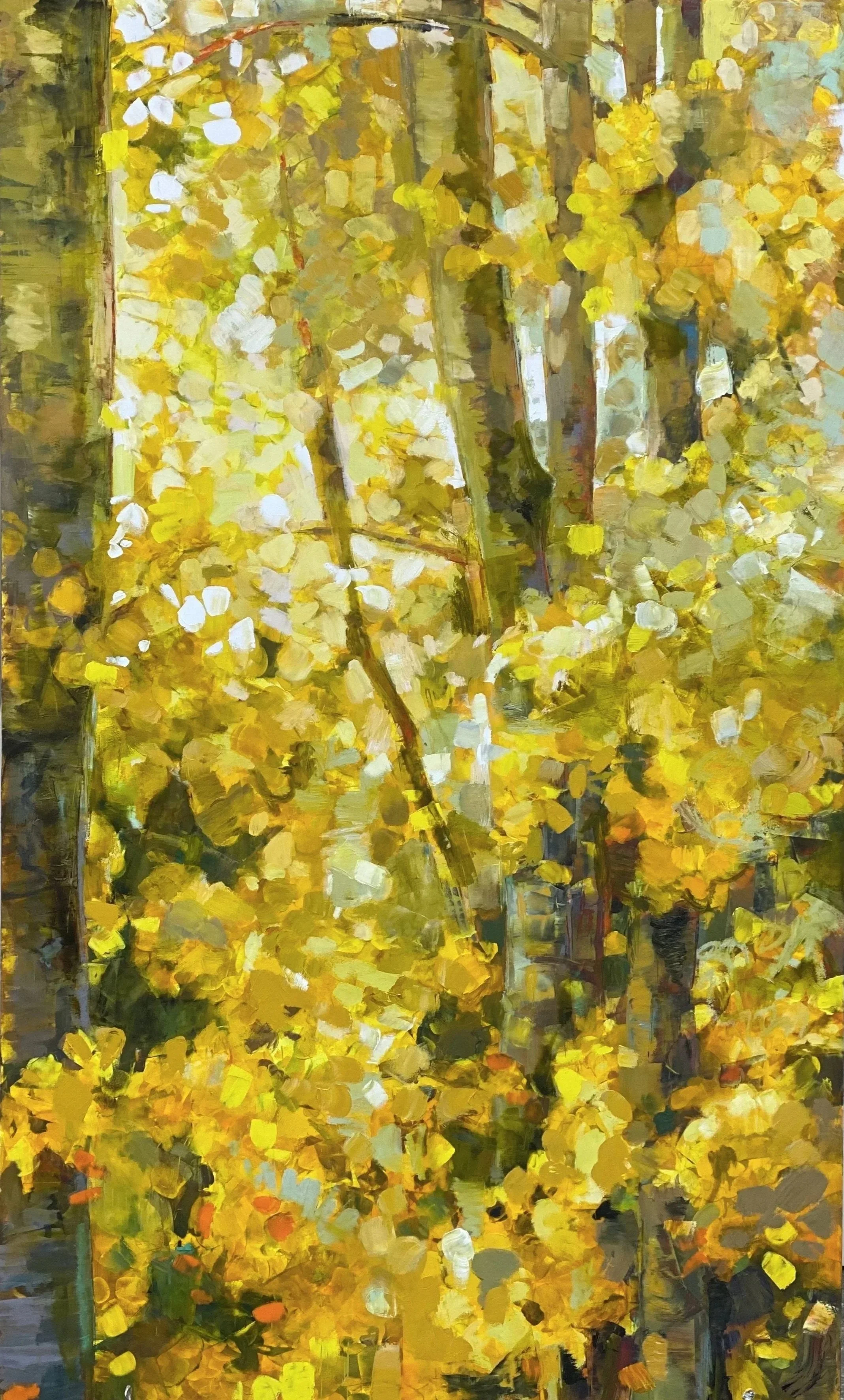Made for a specific wall at the end of a dark hallway, this painting was deliberately luminous — designed to draw the eye from the moment you step inside. A stand of aspens, light filtering through the canopy, bringing a sense of depth and nature to a space that needed both.