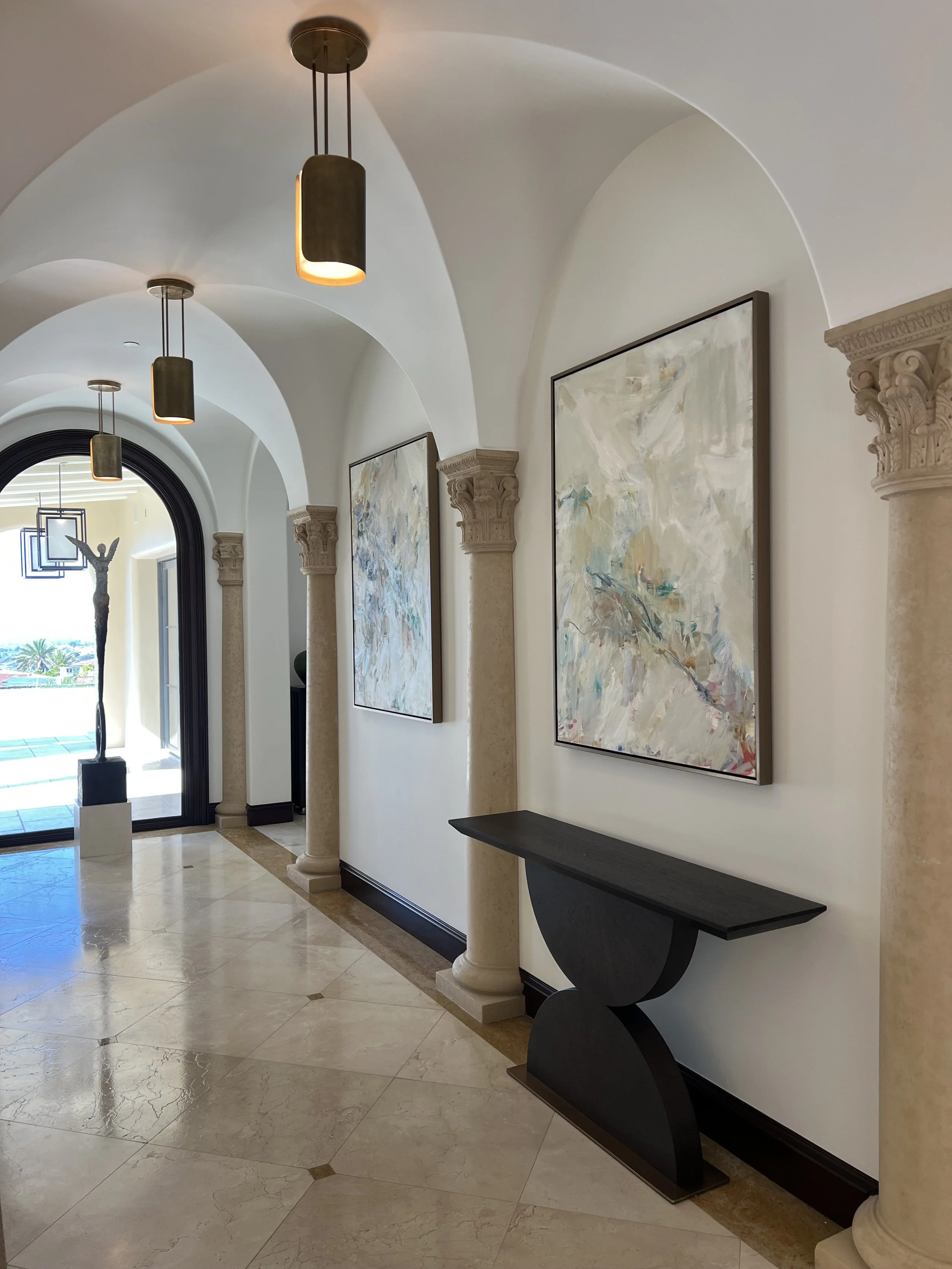 The heart of Gabrielle's practice. Whether abstract or representational, intimate or monumental, each painting is conceived specifically for the space it will inhabit, every facet — from scale to color to its relationship with everything around it. These are not paintings that happen to fit a room. They are paintings made for it.